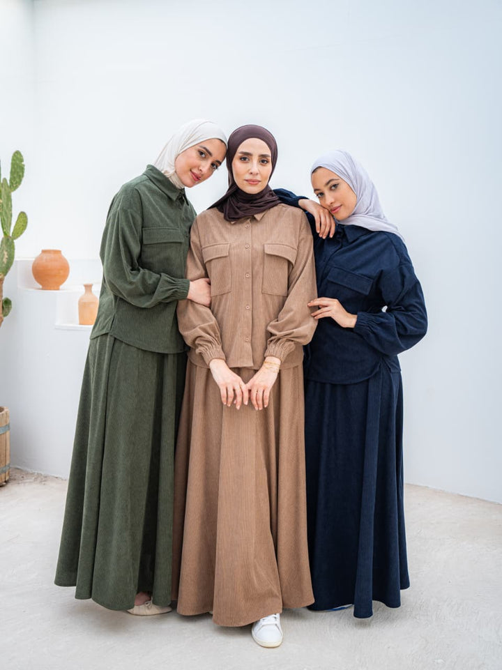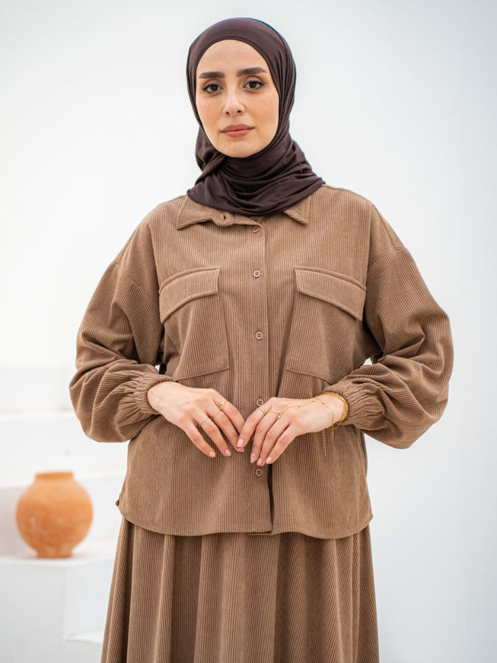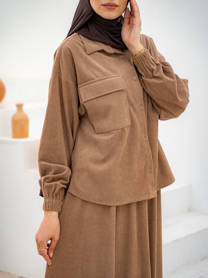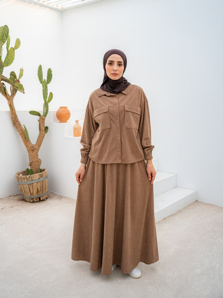 Two-piece ribbed bouclet set in warm autumn tones for an elegant, cozy look.