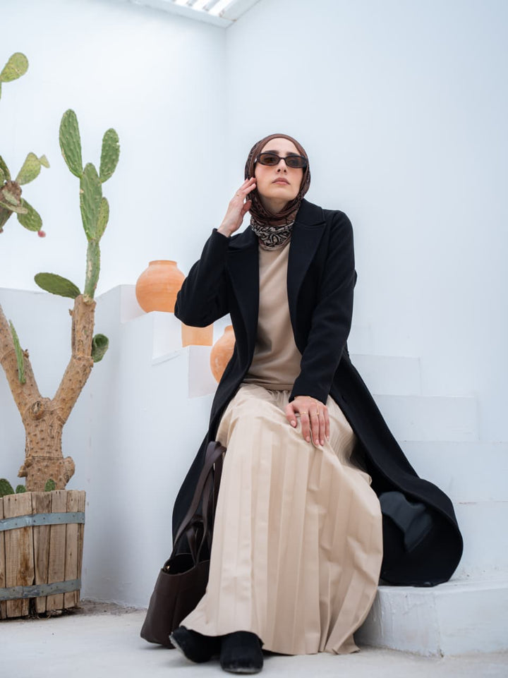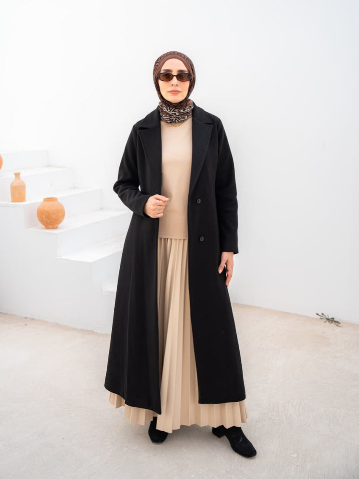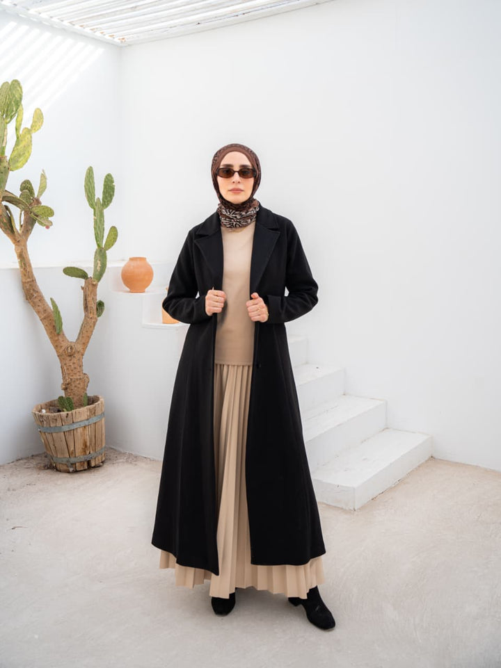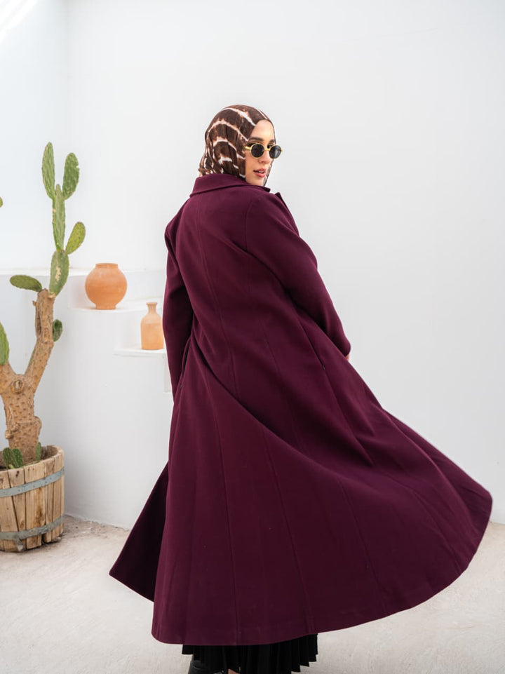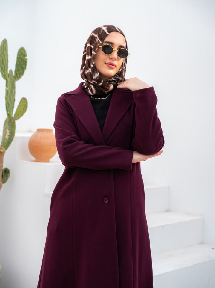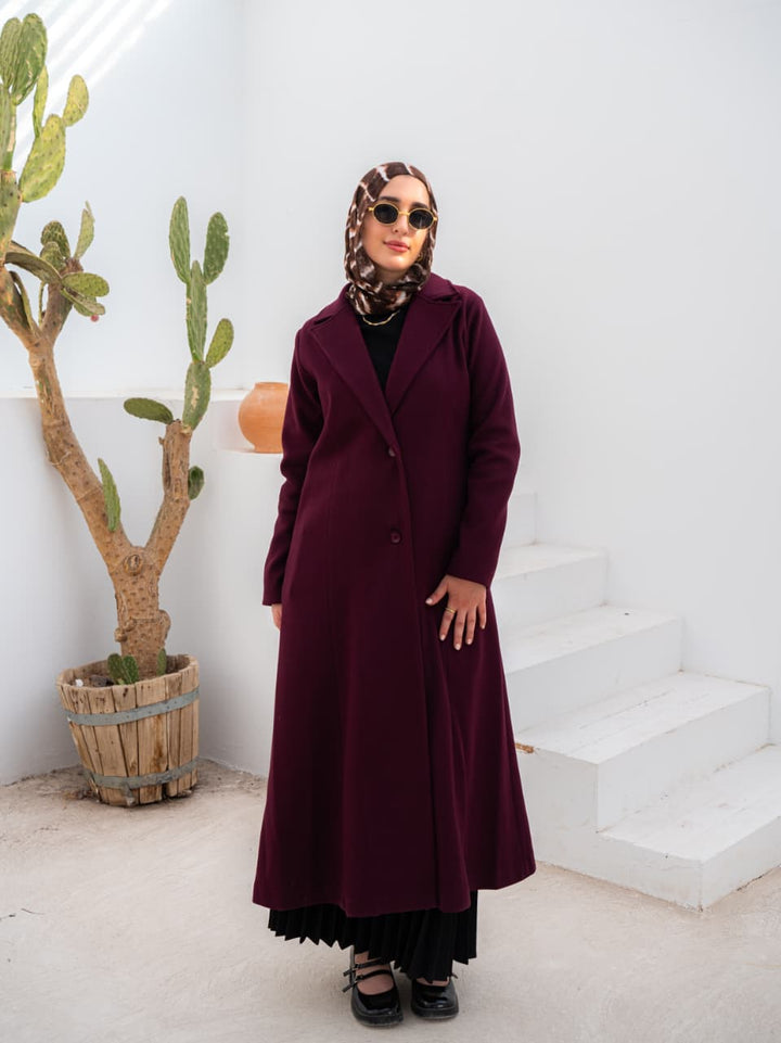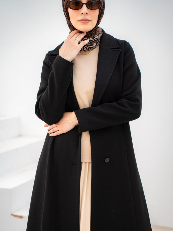 An elegant, longline coat in a rich, deep black and burgundy hue, offering a classic and modest design perfect for elevated your style.