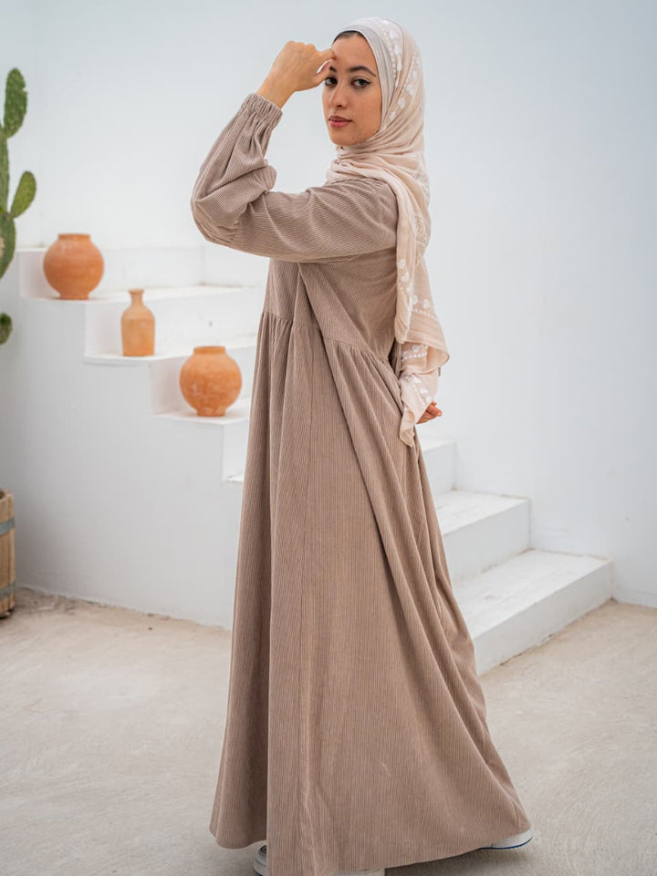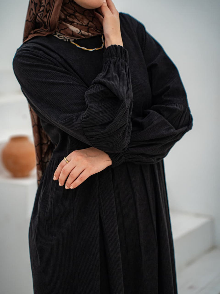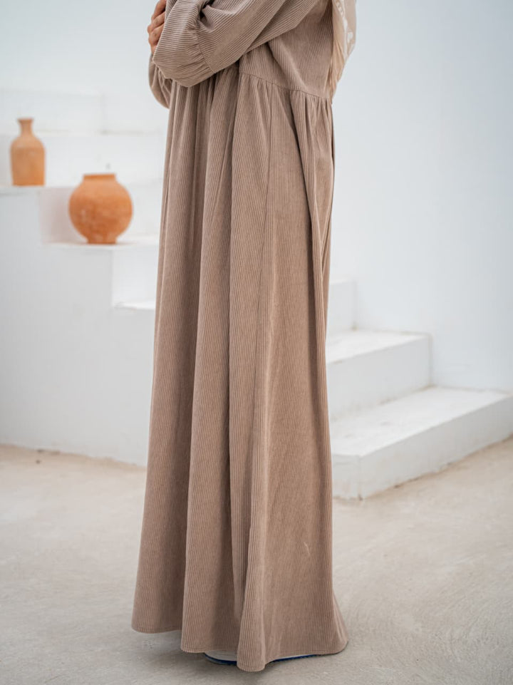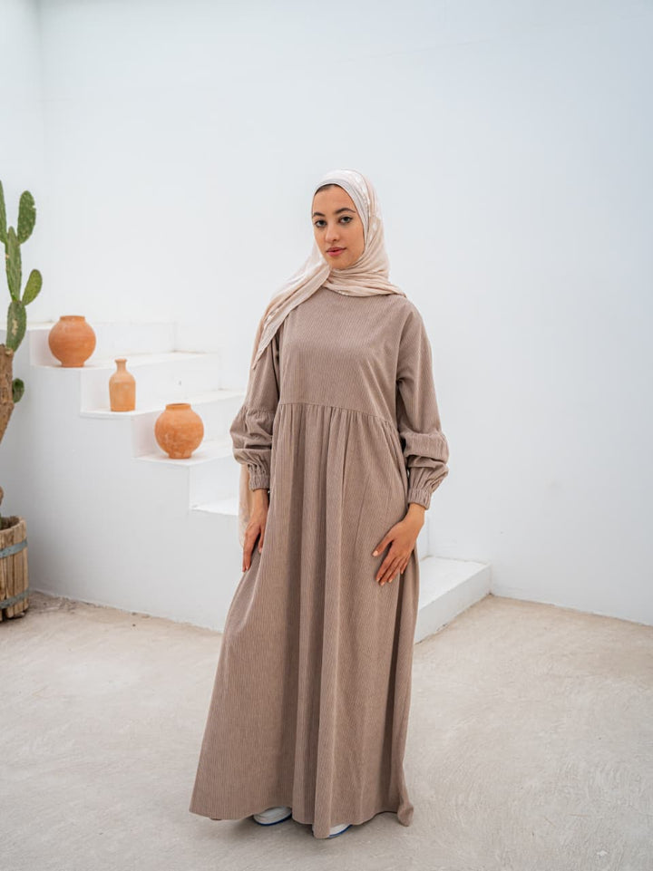 A simple ribbed dress featuring a soft texture and elegant design, perfect for everyday wear and casual occasions. It offers a chic look with a touch of warmth and femininity.