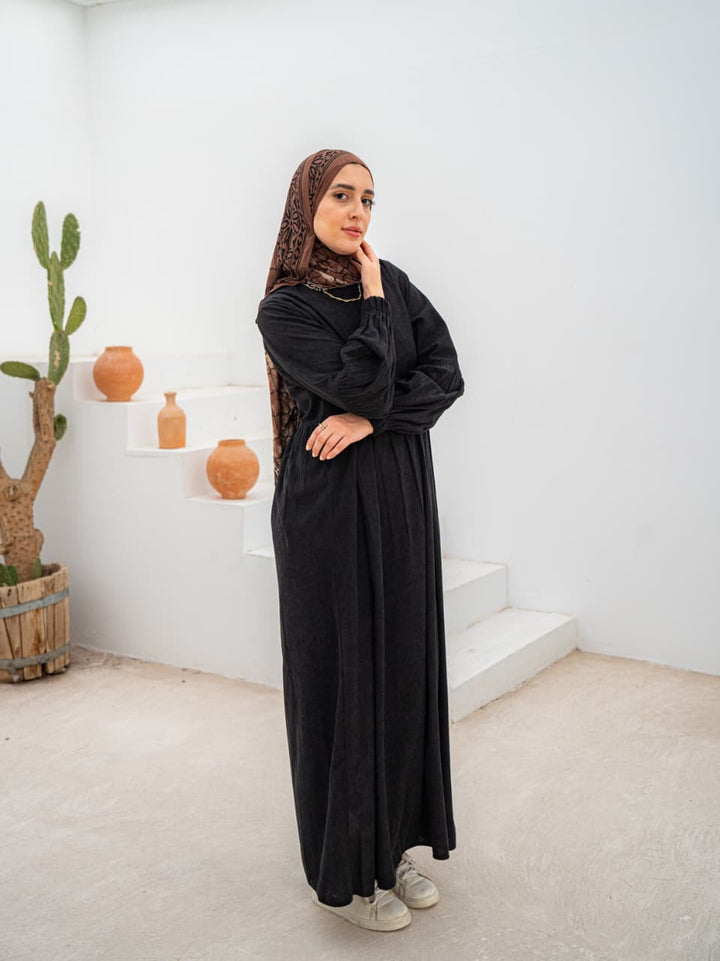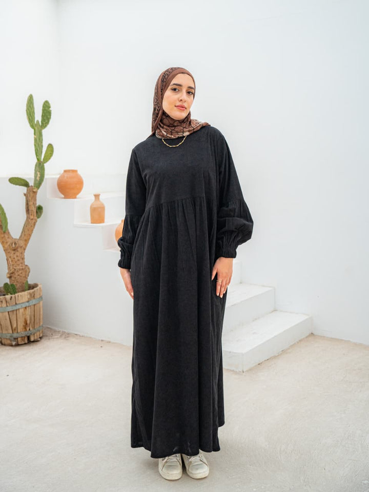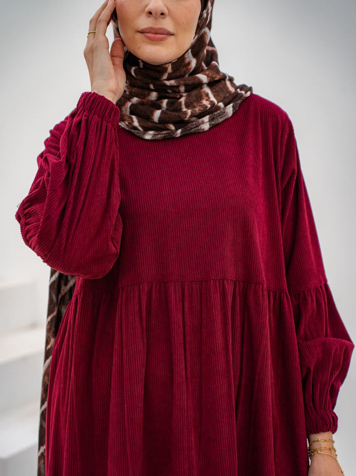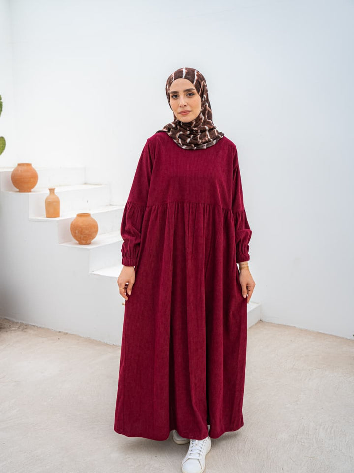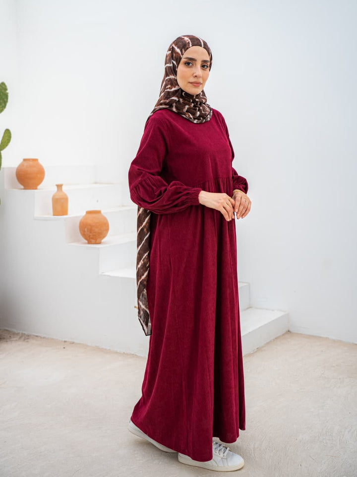 فستان بسيط بخامة بوكلت مضلع، يتميز بملمس ناعم وتصميم أنيق يناسب الإطلالات اليومية والمناسبات البسيطة.