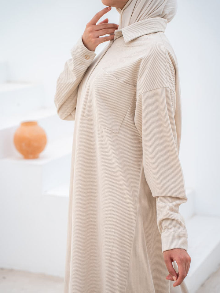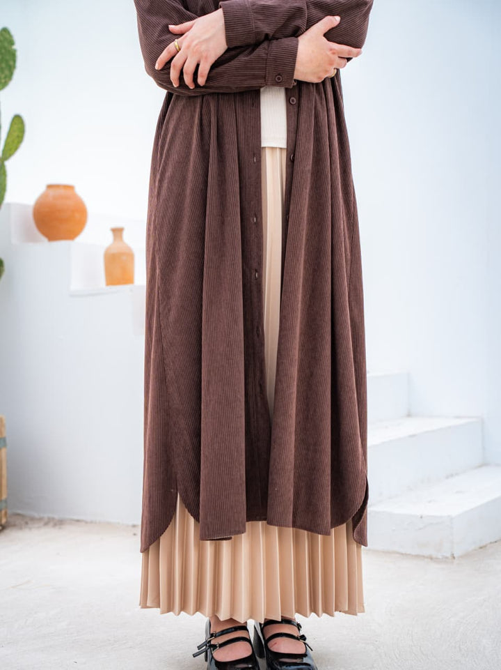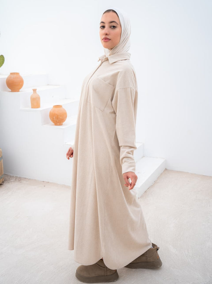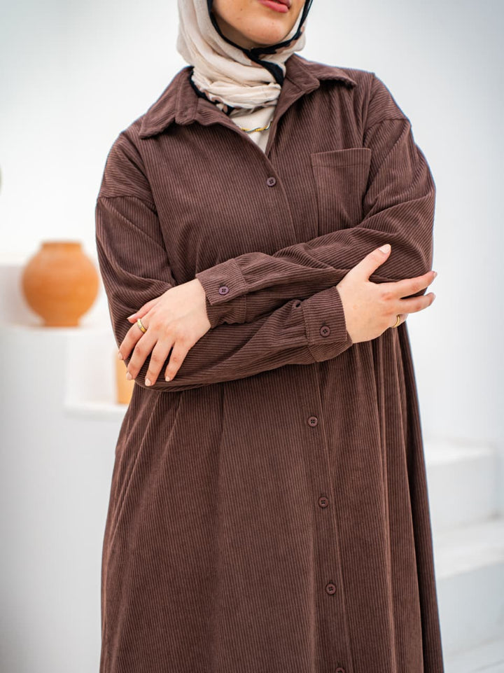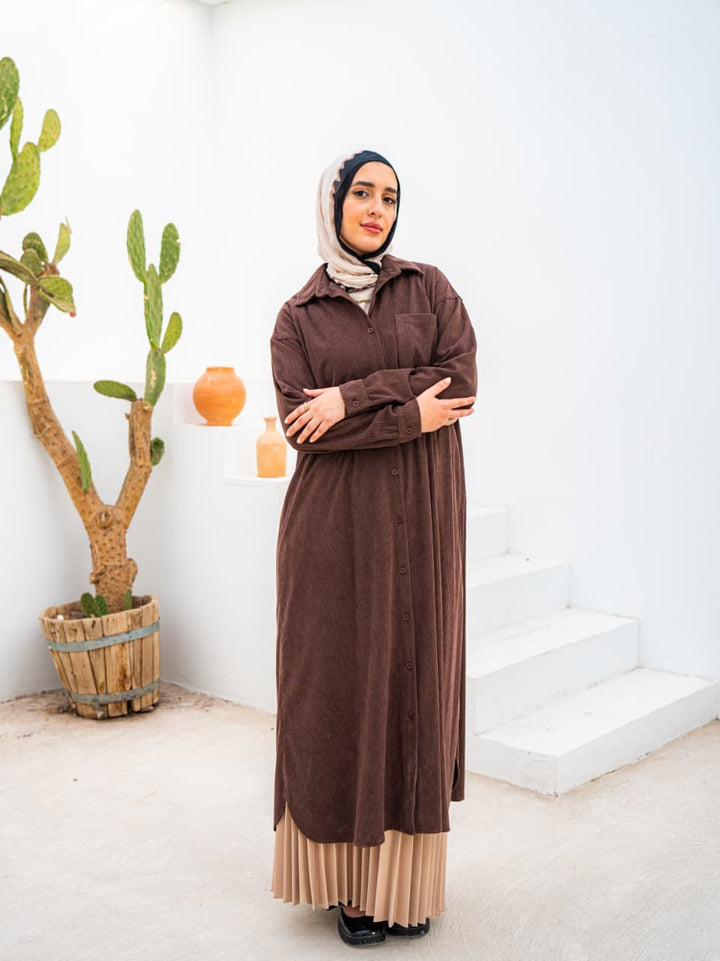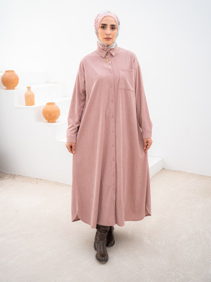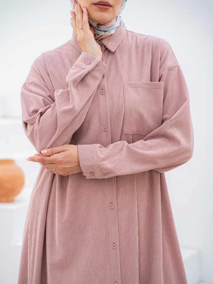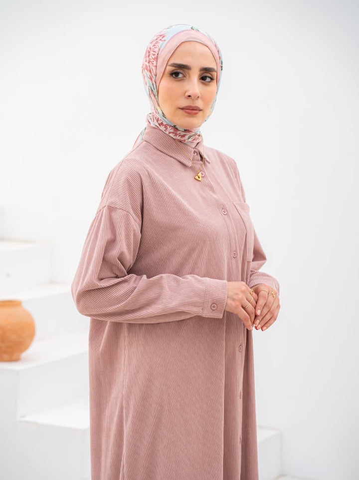 شميز طويل بخامة قطيفة مضلعة ناعمة لإطلالة شتوية دافئة وأنيقة.